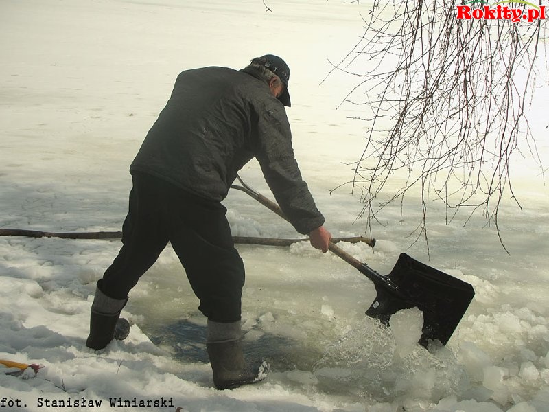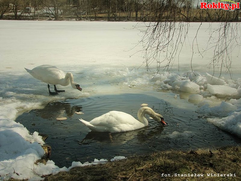 W tym roku nasze łabędzie przyleciały do Rokit wyjątkowo późno, bo dopiero 6 kwietnia; zwykle przylatywały w połowie marca. Ku swojemu zdziwieniu musiały jednak stwierdzić, że jezioro nadal jest zamarznięte. Usiadły więc bezradnie na środku jeziora … i tak by pewnie (głodne!) czekały, aż rozmarznie jezioro, gdyby nie nasz dzielny Anioł Strażak, który natychmiast przybył im z pomocą! Nie szczędząc trudu, ni sił wyrąbał pokaźny kawał lodu, aby łabędzie miały dostęp do wody i mogły bezpiecznie doczekać wiosny. Zainicjował także akcję dokarmiania, którą potem kontynuowali inni mieszkańcy Rokit.